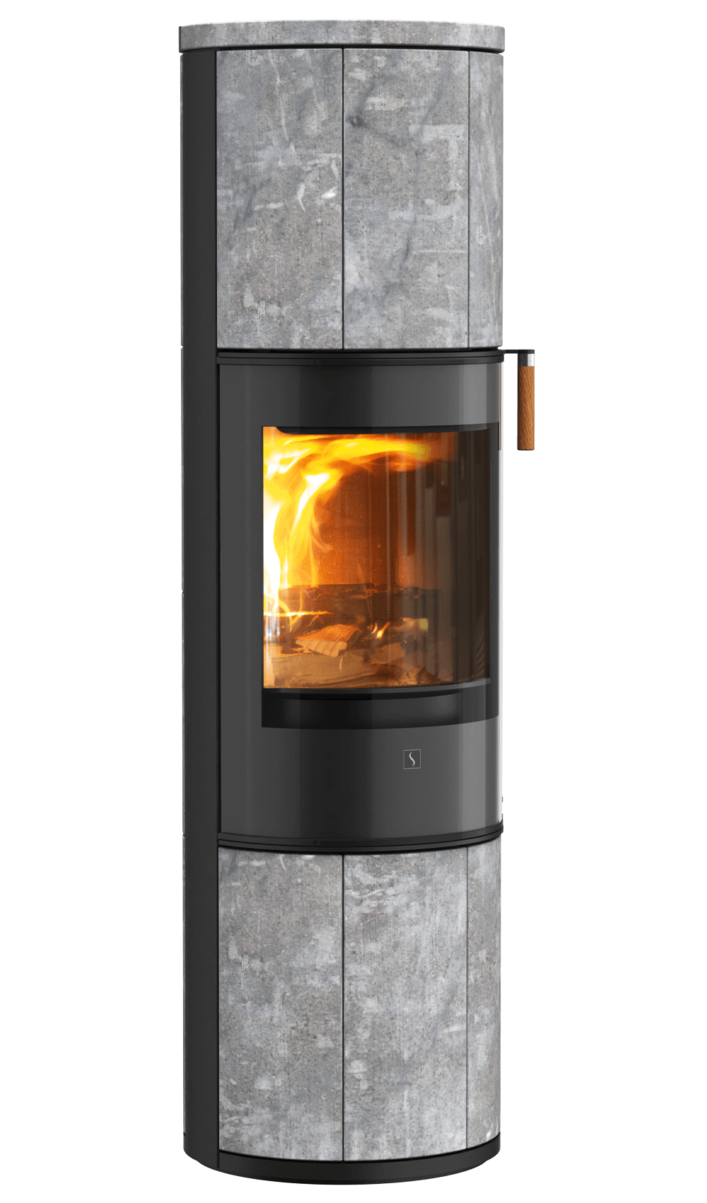 Høy og slank klebersteinsovn med tydelig designuttrykk