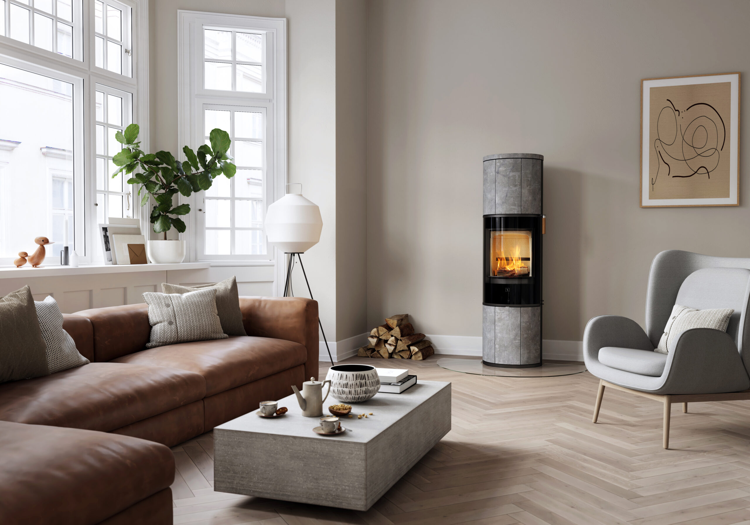 Den høyere modellen i Scan 84-serien har et elegant og slankt uttrykk som fremhever ovnens arkitektoniske form. Med kleberstein på sider og topp får du både et særegent design og effektiv varmelagring. Klebersteinen holder på varmen og avgir den jevnt over tid – for varig komfort og redusert vedforbruk.